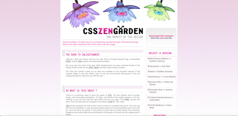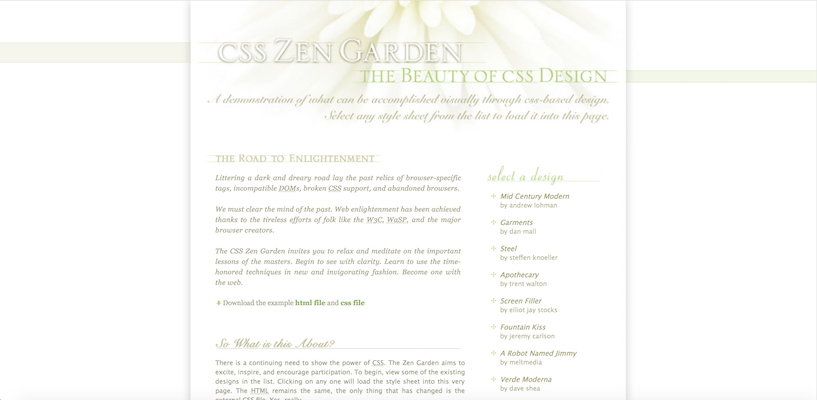 The CSS Zen Garden invites you to relax and meditate on the important lessons of the masters. Begin to see with clarity. Learn to use the time-honored techniques in new and invigorating fashion. Become one with the web.